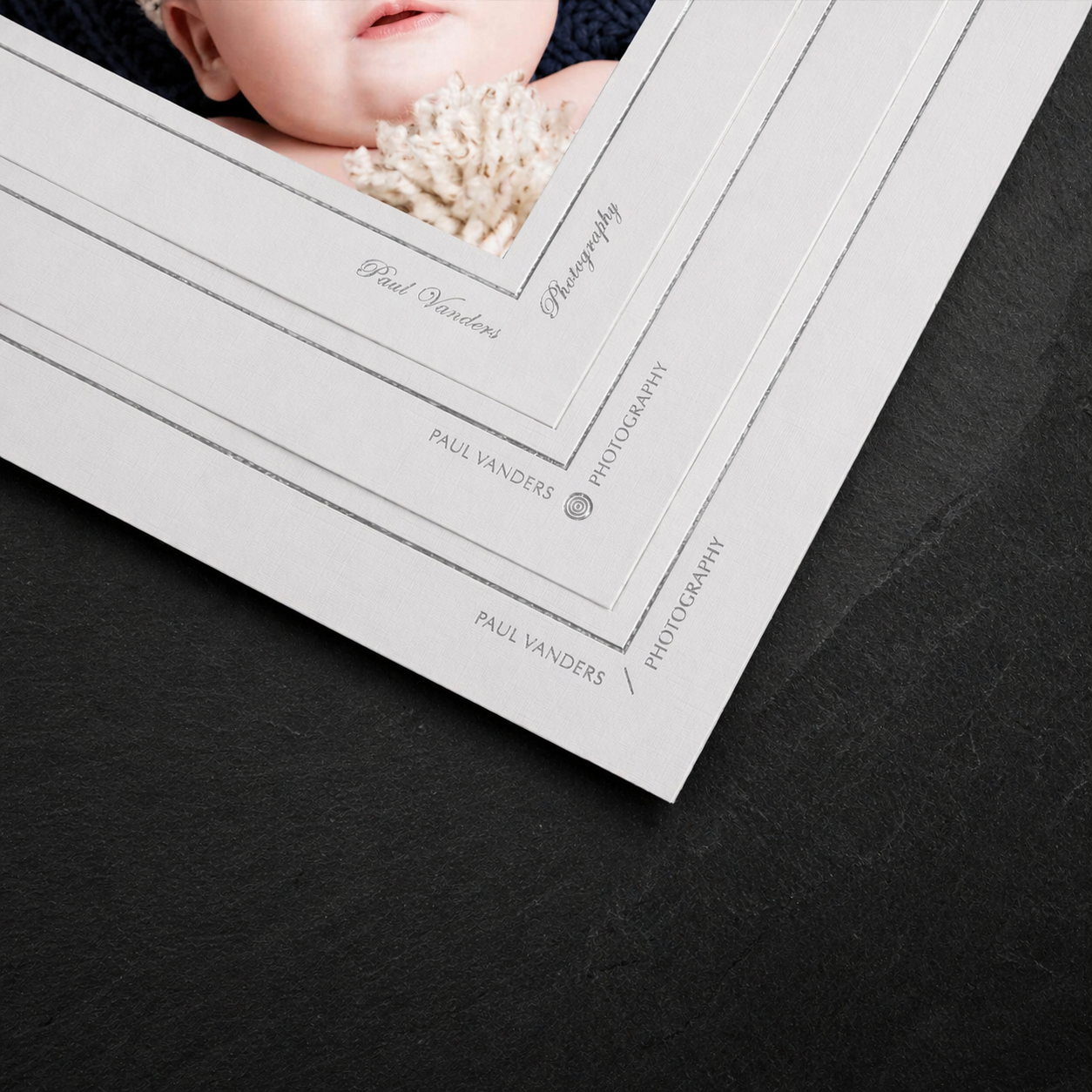 Premium plain fronted slip-in folder with a single foil line around the aperture. There is a complete range of sizes available and all can be personalised with your details free of charge. Available in White / Silver